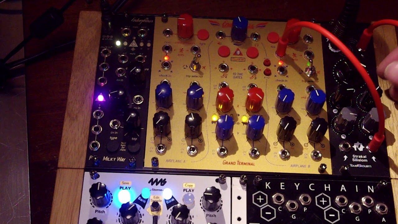 Dieser Patch hat einen LFO, der den Antumbra Knit (ein Miniatur-Mutable Instruments Plaits) moduliert, der eine einzelne niederfrequente Sägewelle hat, die die Filter-Pings auslöst. Beide Kerne des Filters sind in Gebrauch und werden mit dem Stereoregler gespreizt. Nach dem Filter geht es zu einem Miniatur Clouds.