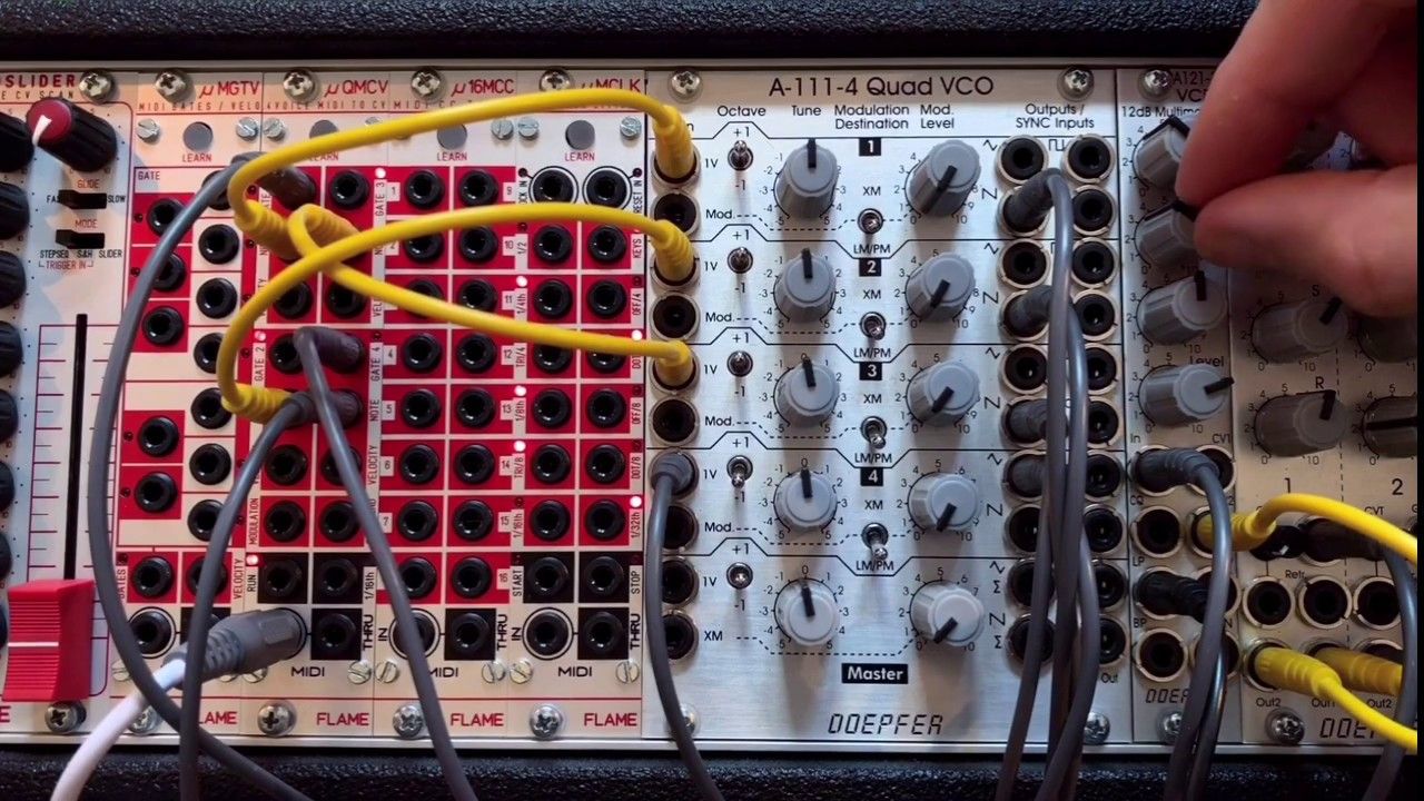 Im ersten Teil des Videos steuert der Flame µQMCV einen dreistimmigen Akkord, der über die MIDI-Tastatur gespielt wird. Der Klang wird vom Doepfer A-111-4 Quad-VCO erzeugt, der mit Hilfe des Doepfer A-121-3 Multimode-Filters gefiltert wird. Im zweiten Teil fügen wir eine Bass-Stimme hinzu, die mit Hilfe des vierten Kanals sequenziert wird, sowie ein paar Drums von einem externen Drumcomputer.