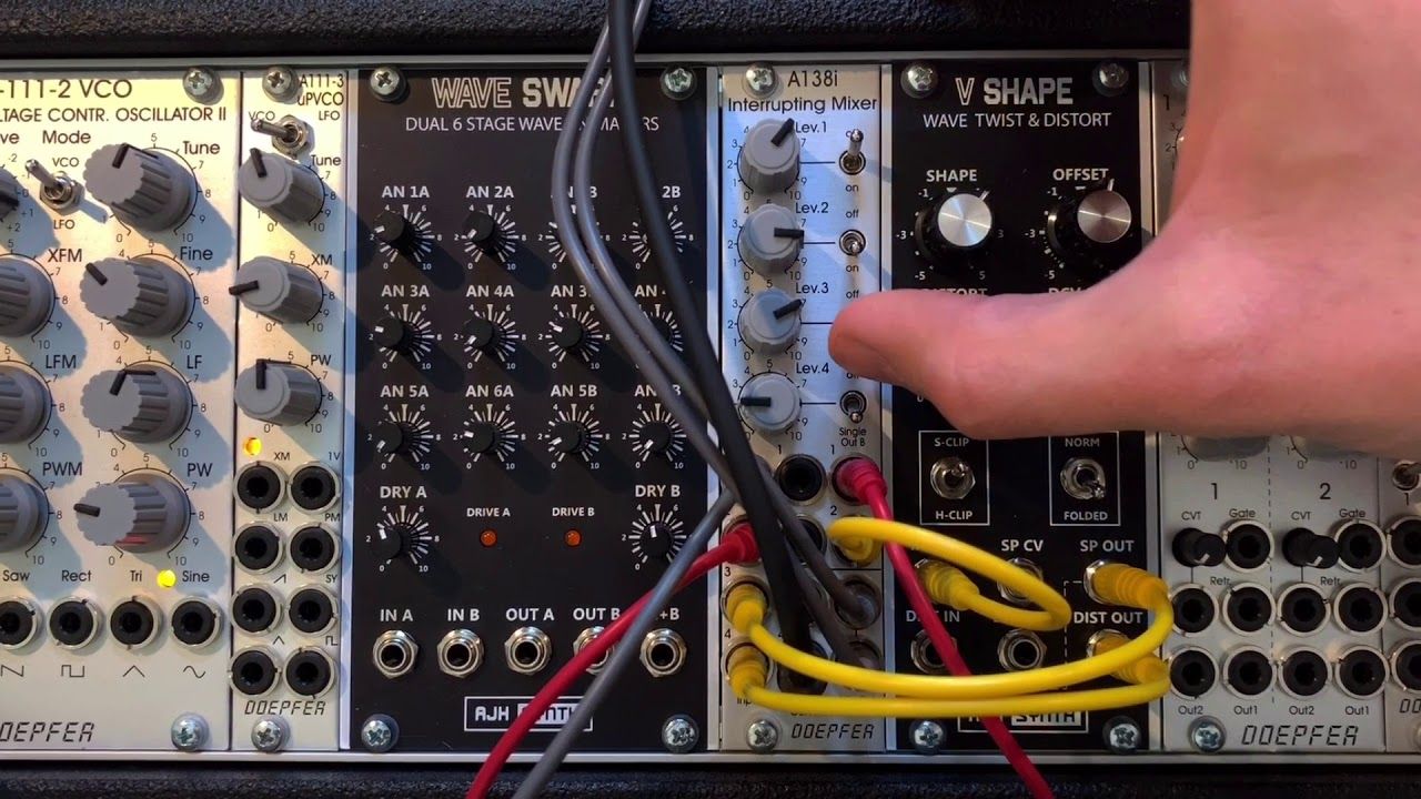 In diesem Video verwenden wir den V-Shape in Verbindung mit dem Doepfer A-138i Interrupting Mixer, um verschiedene Kombinationen zwischen dem Originalsignal und den beiden Ausgängen des V-Shape-Moduls zu erzeugen.