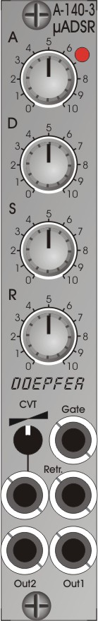 Das Modul A-140-3 ist die Einzelversion des Moduls A-140-2 – mit nur einem ADSR-Hüllkurvengenerator hinter einer 4 HP Frontplatte.