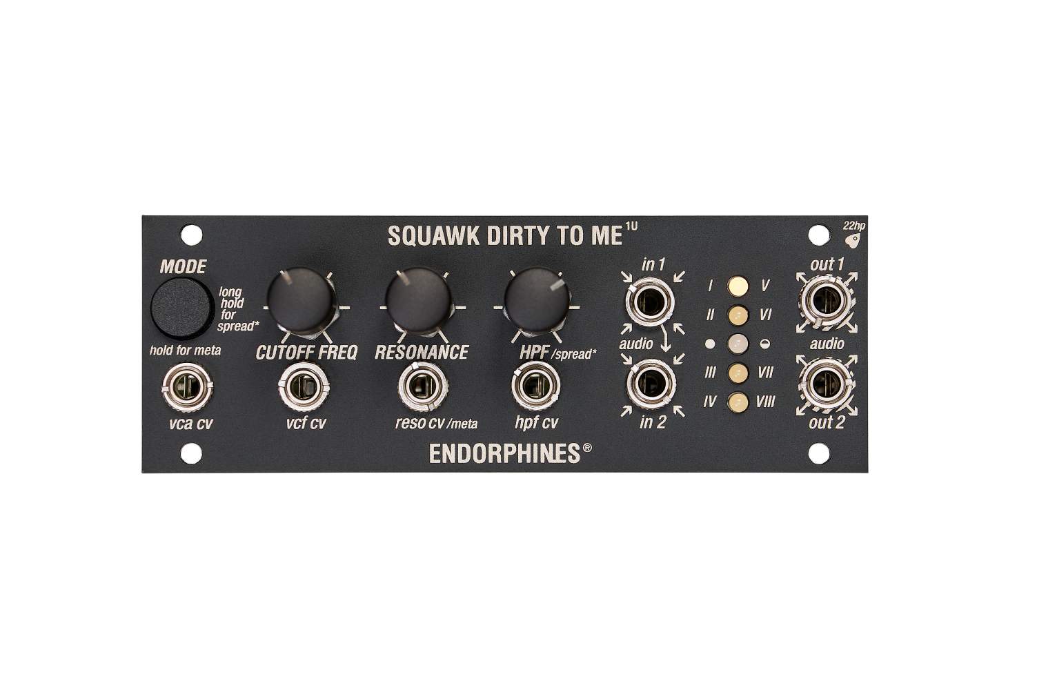 The Squawk Dirty To Me 1U is a stereo filter with voltage-controlled resonance. It features 8 filter modes and zero-delay feedback.