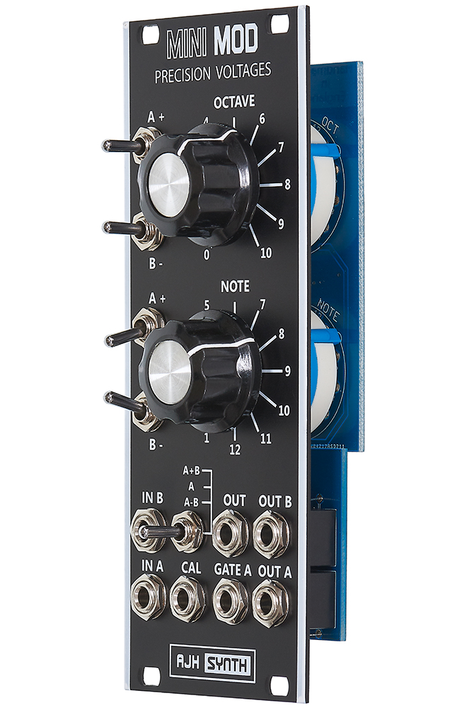 As well as being a precision voltage source it is also a very accurate voltage adder, it has two channels (A & B) and both full volts (octaves) or 1/12th volt increments (notes) can be either added to or subtracted from the incoming signal. Perfect for adding a voltage offset to the output of a sequencer or it can be used to add switchable octaves to a VCO which only has coarse and fine tunes controls.