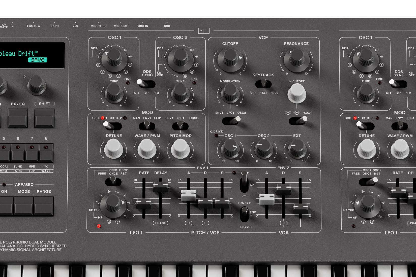- 2-Part Multitimbral, comprising 2 independent hybrid synthesizers, each with its own dedicated set of front-panel controls