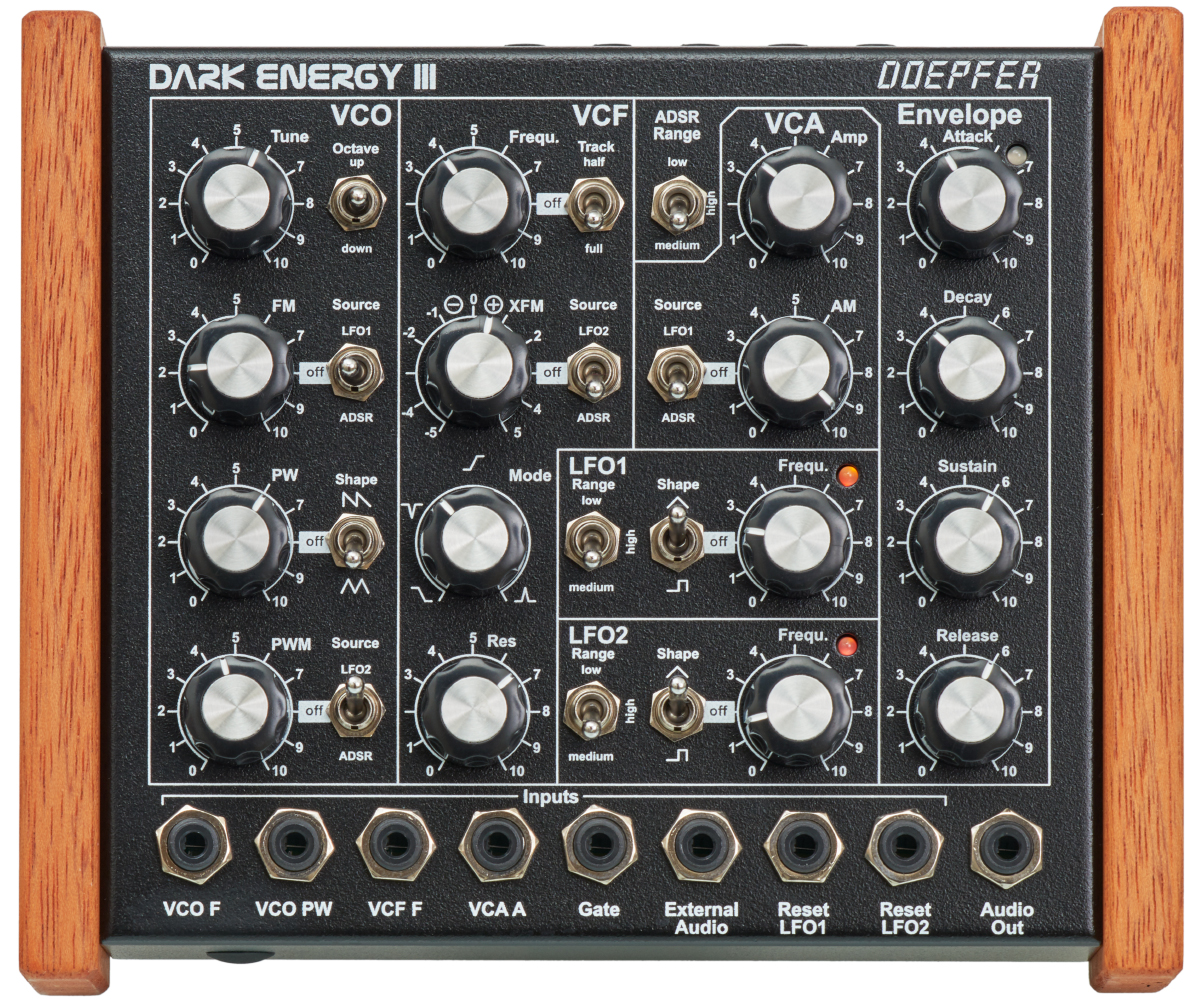 Dark Energy III is a monophonic stand-alone synthesizer with USB and Midi interface. The sound generation and all modulation sources are 100% analog, only the USB/Midi interface contains digital components. Dark Energy is built into a rugged black metal case with wooden side plates. High quality potentiometers with metal shafts are used and each potentiometer - except the filter mode control - is fixed to the case (no wobbly shafts and knobs). The distance between the controls is a bit wider compared to A-100 modules and knobs with vintage look are used.